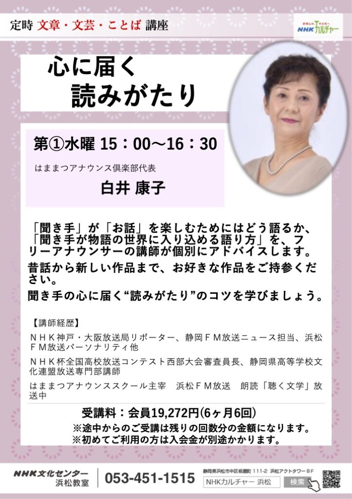 投稿公開日:2026年3月19日 おすすめ FMHaroで白井康子の朗読を放送中!(放送時間の変更) 2025年3月26日 声が変わると人生が変わる!話し方・伝え方レッスン NHK文化センター浜松教室 2025年8月31日 オフィス移転のお知らせ 2021年12月23日 その他の記事を読む 前の投稿顧問 殿村收史逝去のお知らせ
